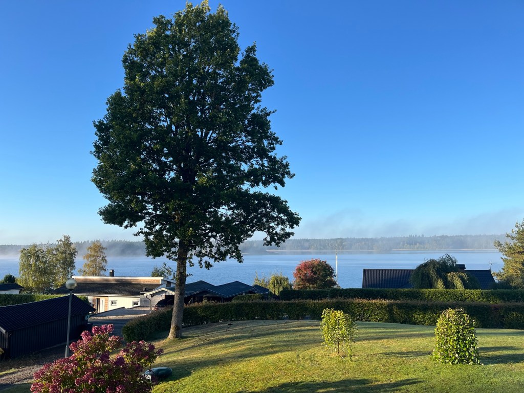 Snart kommer mamma med färdtjänst. Å Henry o Alexandra. Lite senare kommer David o Matilda. Har sett fram emot detta så. En vacker höstdag har vi haft. Ja jag tjatar om vår utsikt men morgonen är så underbar. Eller hur?