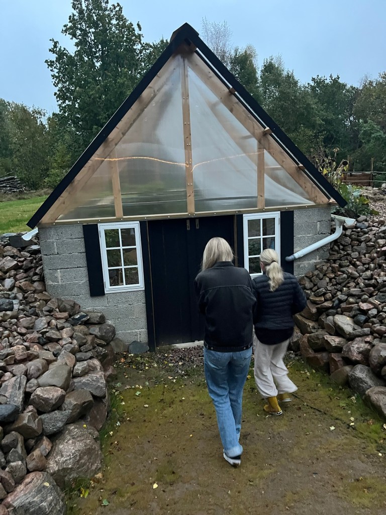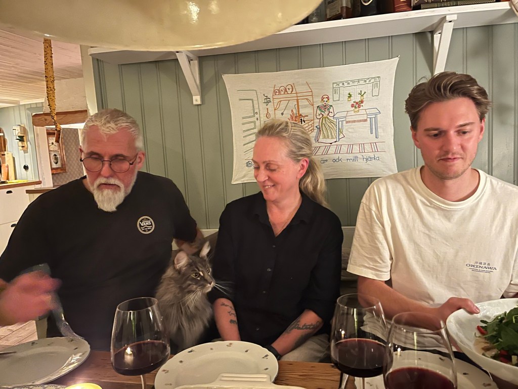 Framåt tidig kväll åkte vi tillsammans till Olivers föräldrar som bor på en fantastisk plats lite utanför Dannike. De har varsamt renoverat samt byggt ut ett torp och hela alltet är så mysigt. Det är dessutom nästan som att vara på zoo. Vi hälsade på deras fina getter Sigrid och Ingrid och deras goa lurviga hönor. Inomhus återfinns katterna Asta och Gösta där sistnämnde nästan liknar ett lodjur. En speciell sort, Maine Coon, så fin. De har stora odlingar, på land och i växthus. Vi kollade in deras senaste projekt, ett växthus som mer eller mindre är under marken. Fina plantor av kiwi, vindruvor och physalis. Vi satt i det mysiga köket till midnatt och timmarna gick alldeles för fort. Fantastisk god mat bjöds vi på. STORT tack Patrik och Anette! Vi sov som stockar i deras gästrum i natt. Johanna och Oliver sov i deras nyinköpta husvagn, jubileumsmodell från Knaus. Fattade jag rätt finns det bara 13 st exemplar i Sverige. Liten som ett ägg men jättefin.