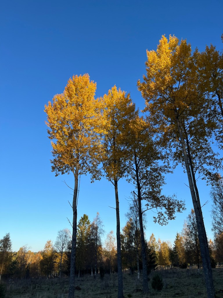 Alltså vilken underbar dag. Det vackraste oktobervädret man kan tänka sig, Brittsommar heter det väl nu. Trädens gula och röda löv blir så oerhört vackra ihop med blå himmel och sol.