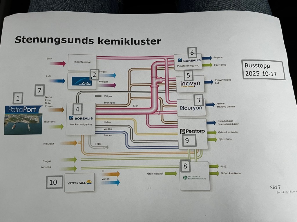 Därefter fick vi en suverän guidning av kemiklustret i Stenungsund. Jag har ju sett alla skorstenar många gånger när vi varit här och nu vet jag mycket mer. Men det är rörigt…. Se bifogad bild. Vi gjorde ett antal stopp vid många av dessa kemiföretag och vi fick absolut inte fotografera eftersom allt det här är skyddsobjekt. Många rör som går kors och tvärs från företag till företag och mycket gas, är förundrad över att allt bara fungerar.