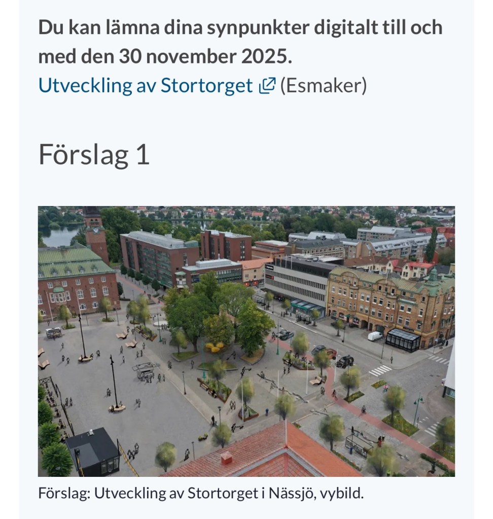 Framtiden börjar nu. Vi har chansen att påverka. Jag har tyckt till – gör det du också. Tillsammans kan vi forma ett Stortorg som blir Nässjös stolthet. Fram till den 30 november kan du kika in på Nässjö kommuns hemsida och tycka till.