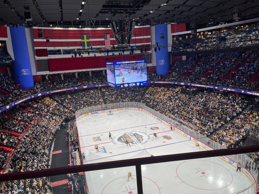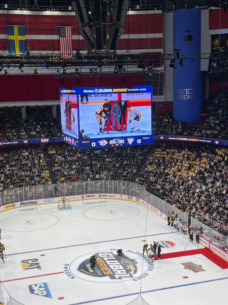 Jonas och jag gick ned till KungstrÀdgÄrden nÀr jag hade anlÀnt till huvudstaden. MÀngder med hockey-aktiviteter för barn (och vuxna). Mötte Jonas syster, hennes barn och barnbarn som kört till Stockholm med bil. Jonas och jag delade pÄ en himmelskt god pizza och sedan orkade vi gÄ till Globen. SÄ skönt att fÄ röra pÄ sig efter ett antal ganska stillasittande dagar. Erik hade fixat plats Ät oss i en sportloge och dÀr fanns hur mycket god mat som helst. VÀldigt synd att just den informationen hade fallit bort mellan pappa och son för vi var inte sÀrskilt hungriga efter pizzan. Vilken match!!! Vilken första period!!! 3 mÄl för Pittsburg. Erik skötte sig med den Àran. Jonas var sÄ stolt. Jag ser det i blicken och det Àr ju inte sÀrskilt konstigt. JodÄ, vi kÀkade i första periodpausen och med i logen fanns Àven Eriks fru Melinda och nÄgra kompisar till Erik. Trevligt! Matchen slutade 4-0 sÄ seger till pingvinerna. HÀrligt.