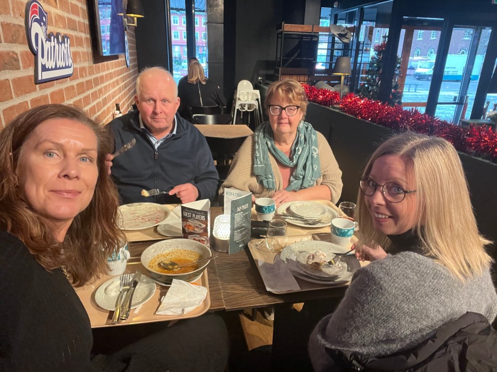 En god lunch med vĂ„rt gröna gĂ€ng pĂ„ OâLearys. Soppa och goda pannkakor. Det gav energi till eftermiddagens pass. Nu sitter jag framför elden och bara slappnar av. En tuff dag för hjĂ€rnan.