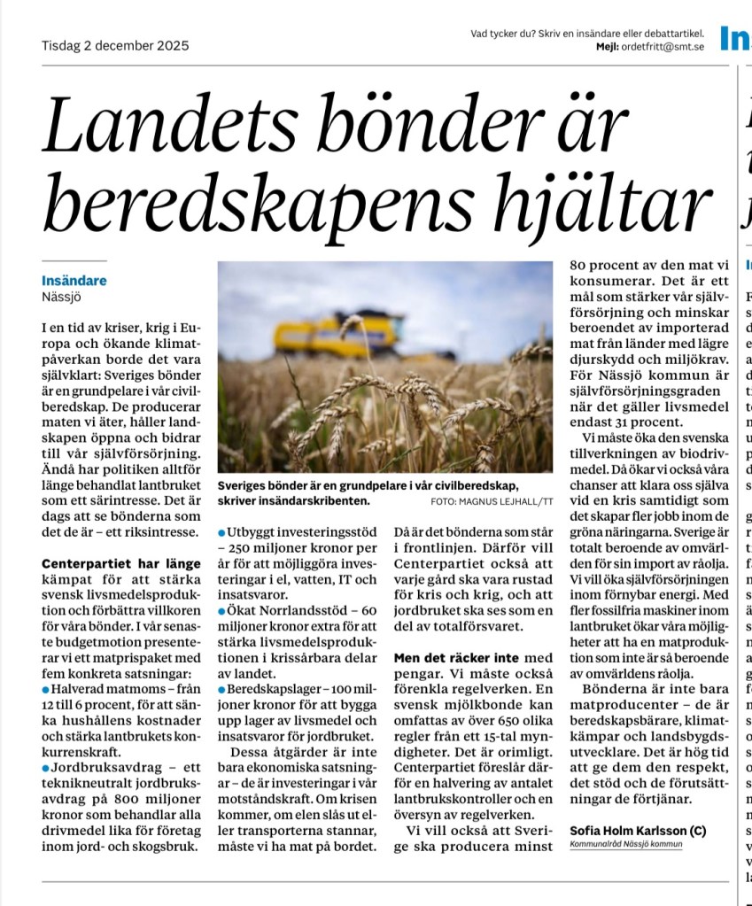 Å idag publicerades min insändare om bönderna som beredskapshjältar. Det var drygt två månader sedan jag skrev den och den var med i digitala varianten av tidningen rätt så snabbt. Sen kom den aldrig i papperstidningen. Men idag så. Härligt! Det är så sant!!