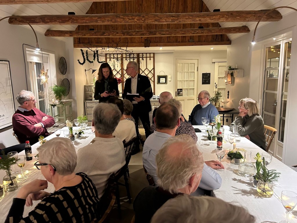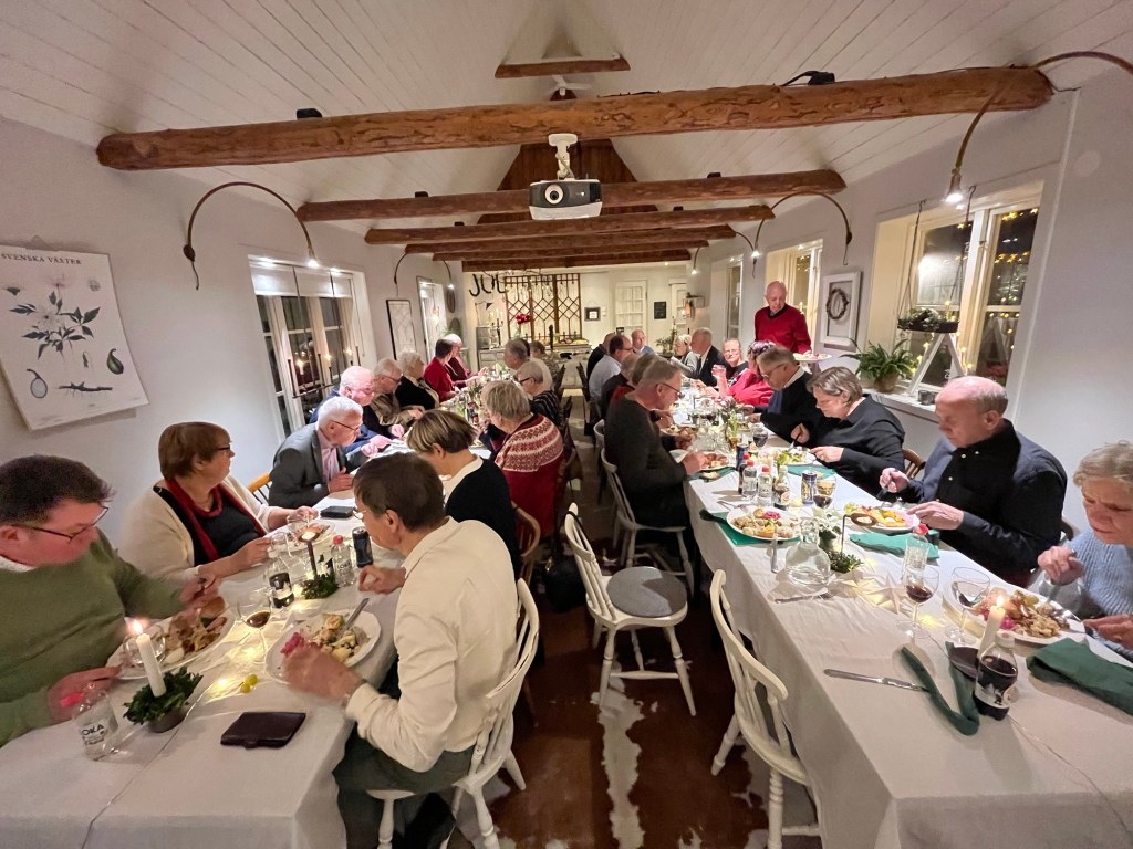 I gĂ„r kvĂ€ll samlades Centerpartiet krets NĂ€ssjö för julfest. I Ă„r hade vi förmĂ„nen att fĂ„ Ă€ta helt underbart god och hemlagad julmat i NĂ€mndemannagĂ„rden i Rödja hos Kerstin och HĂ„kan Ahlstedt. SÄÄÄÄ gott! En mycket trevlig afton i en mycket vacker miljö och dessutom god mat â det kan inte bli sĂ„ mycket bĂ€ttre. Till kvĂ€llen hörde ocksĂ„ utdelning av fina julblommor till ordföringar och vice ordföringar (Claes Rostedt ordförande för Höglandets rĂ€ddningstjĂ€nstförbund, Kjell Hellqvist ordförande Linden, Ronnie Johansson â vice ordförande tekniska servicenĂ€mnde) vilka har gjort ett mycket fint jobb under Ă„ret. Stort tack!! Tommy Friman, ordförande CitynĂ€tet var inte pĂ„ plats i gĂ„r â Ă€ven han har gjort ett kanonjobb under Ă„ret. Ann-Cathrin Gunnar fick en blomma för ALLT hon gör â ovĂ€rderligt (hon Ă€r vĂ€rd en hel blomsteraffĂ€r). Hon och hennes make fick ocksĂ„ ett samlarmynt av numismatikern Urban Persson â för allt jobb de lĂ€gger ned. SĂ„ kul!