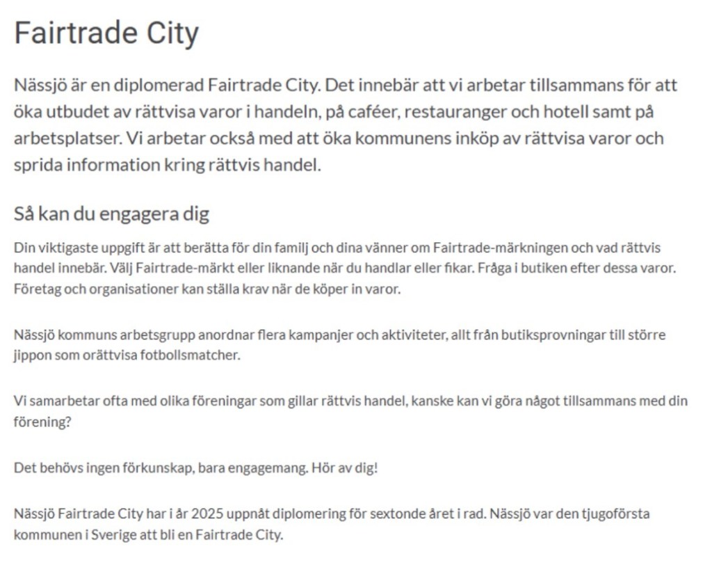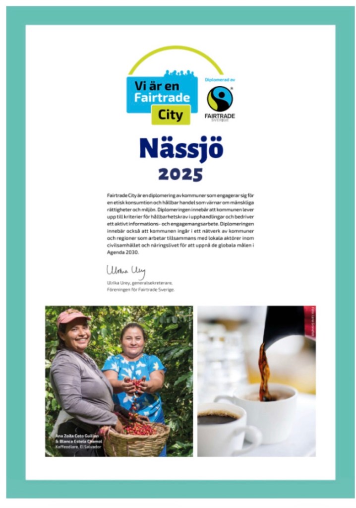 NÀssjö kommun blev utsedd till à rets Fairtrade-kommun 2025 vilket innebÀr att vÄr kommunen har utmÀrkt sig nationellt i sitt arbete för rÀttvis handel och hÄllbar konsumtion. Diplomerade har vi varit lÀnge men att fÄ en nationell utmÀrkelse Àr stort. Det Àr ett bevis pÄ att vi visat extra stort engagemang och lÄngsiktighet i arbetet med Fairtrade. Vi har bland annat varit extra ambitiösa med arbetet att öka kunskapen hos invÄnare och medarbetare. Dessutom har vi en hög andel köpta Fairtrade-produkter i vÄra upphandlingar.