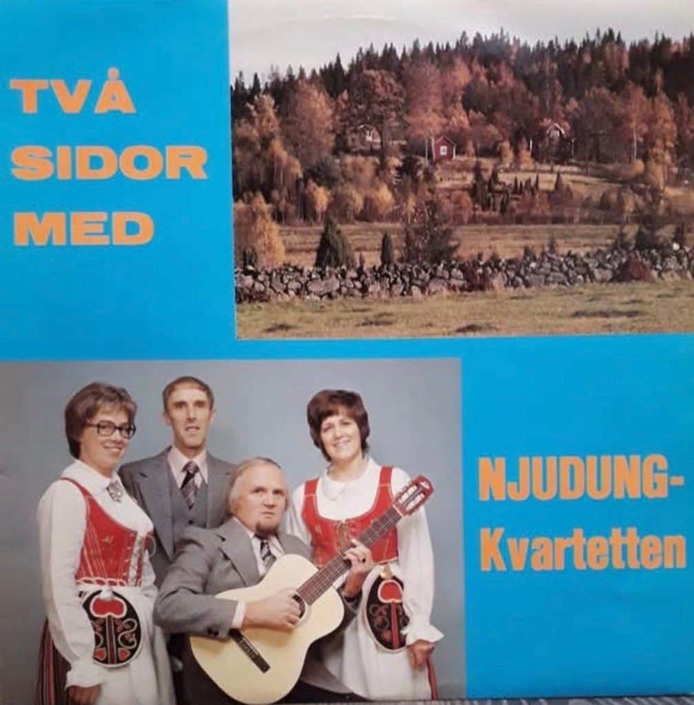 I går ramlade över ett gammalt foto som visar skivomslaget från den LP som mamma var med och spelade in 1976. Hon ingick i en grupp som kallades sig Njudungskvartetten, två kvinnor (mor och Gunbritt Wetterholm som sjöng sopran och alt) och två män (Karl-Erik och Arne Axelsson som sjöng tenor och bas – de var bröder). Jag var inte särskilt gammal när de höll på som mest men jag minns att de var ute och spelade ofta. Bland annat underhöll de på invigningen av Parkgården 1979 (kan ha varit 1980 också). Det var stort på den tiden.