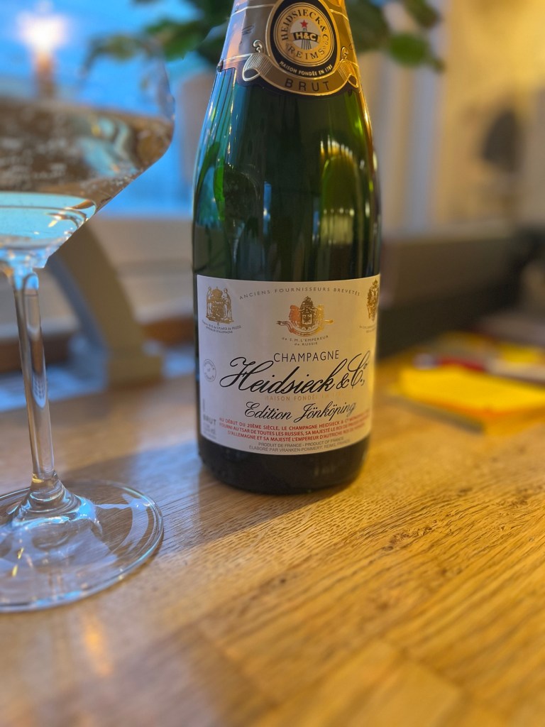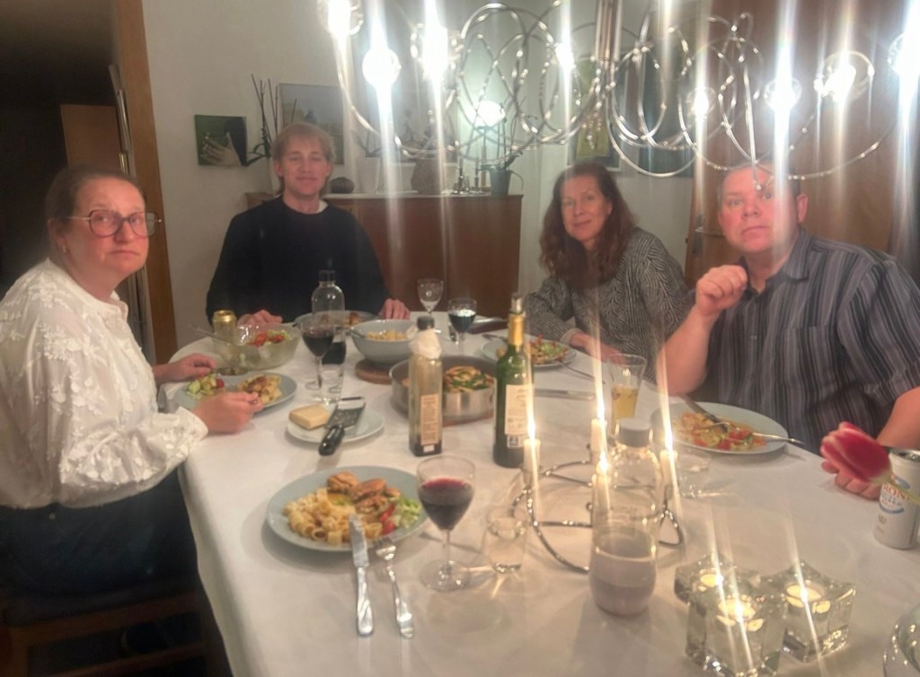 Igår gick vi runt Träslända med vännerna Claes och Cissi. En blåsig historia och vi var rejält vindpinade när vi var åter. Gott ändå med friskt luft och några steg. Vi gjorde mat tillsammans eller rättare sagt Cissi. Jag dukade i alla fall. Grabbarna tände en brasa och hamnade där. Middagen smakade ljuvligt, kyckling och pasta. En fantastiskt god champagne bjöd de oss på. Den var så mjuk och fin. 🍾