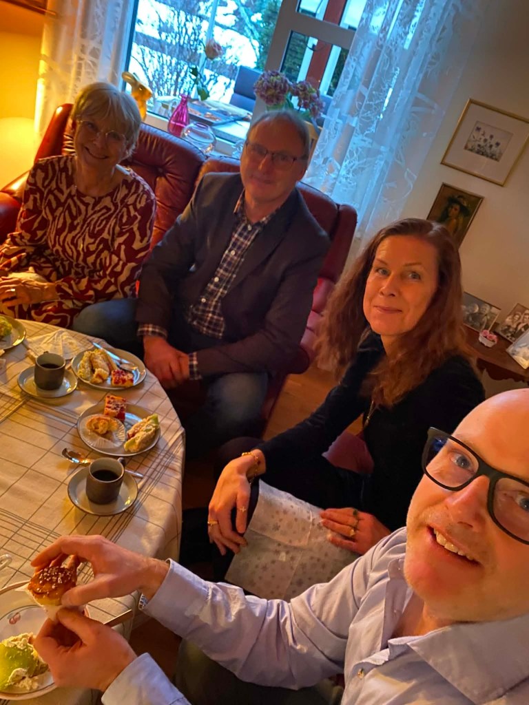 IgÄr var vi bjudna tillsammans med mina bröder, mor och Magnus syster Bodil med man samt hans svÀgerska till hans hus i Jönköping. Hans döttrar med familjer hade ordnat det sÄ fint. Kaffe med bullar (Magnus gjort) och tÄrta, lekar och sedan vÀrldens godaste tre-rÀtters. Skagen-toast, sotad lax och créme brûlée. Mums pÄ allt!!