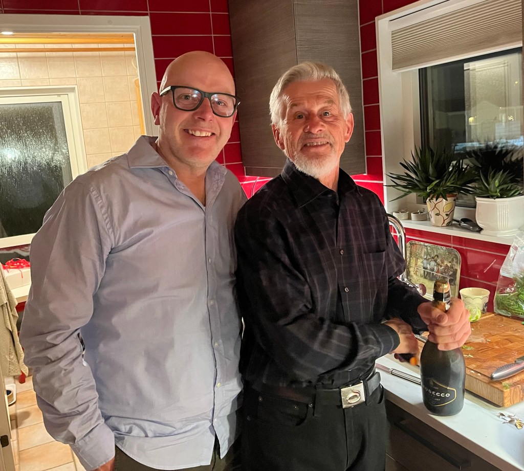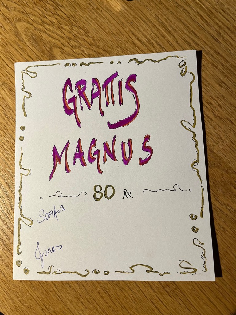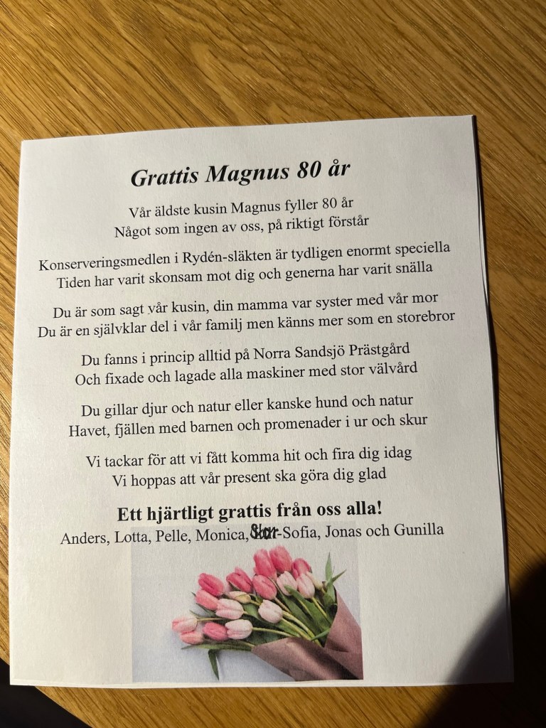 IgÄr firade vi vÄr Àldste kusin Magnus som fyllde 80 Är i slutet av december. Precis som jag skrev i min grattis-dikt kÀnns han mer som en bror till oss, Àn som en kusin. Mamma var 7 Är nÀr han föddes och blev tillika moster. Magnus döttrar Sofia och Hanna Àr mina kusinebarn men de kÀnns mer som mina kusiner och vi har umgÄtts mycket genom Ären.