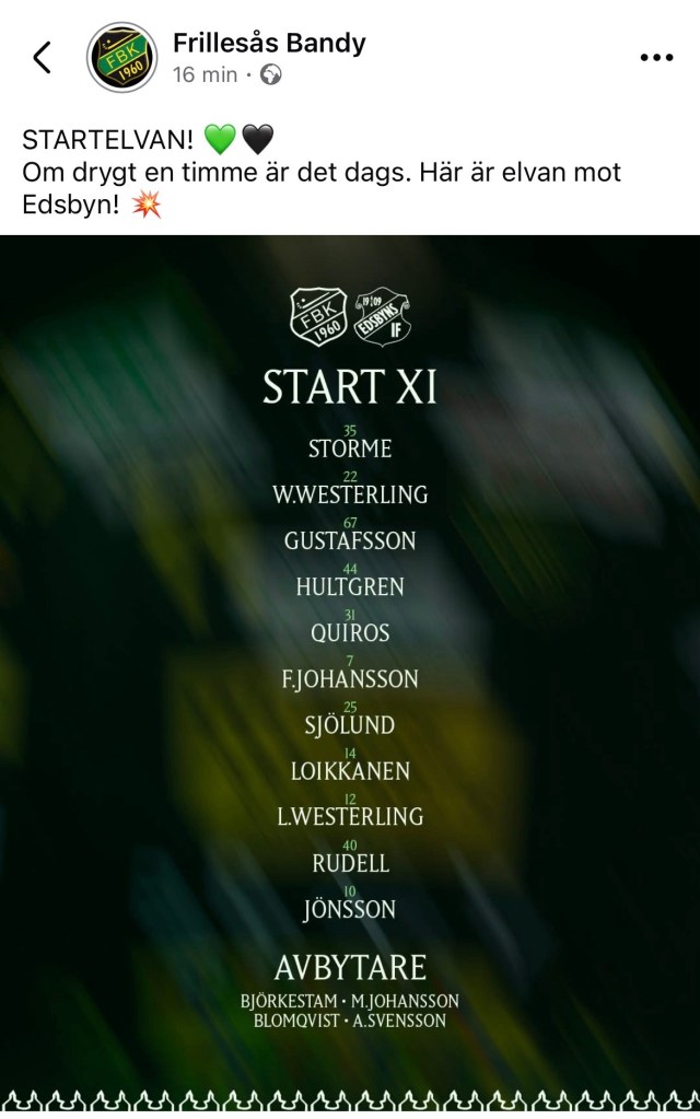 Första halvlek gick knackigt för Frillesås och Edsbyn kom igenom hela tiden. Men i andra halvlek vände hemmalaget matchen och Frillesås kom nästan ifatt. Förlust med 3-4. Surt men den straffen som David tog kändes som en seger! 🌟 Så gott att höra berömmen om David på läktaren. Jag blir så stolt. Skönt att få prata med David efter matchen. Han var nöjd med sin insats och det är viktigt för mig.