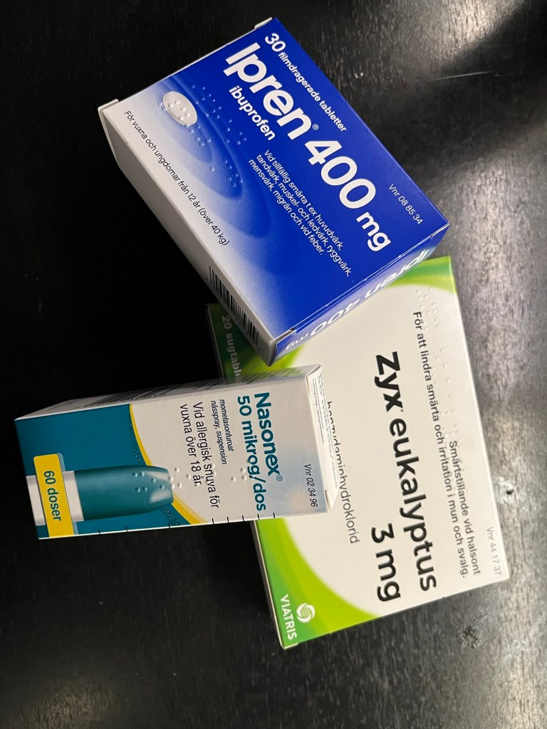 Det var precis detta jag fasade för. Har inte varit förkyld eller sjuk pĂ„ 1,5 Ă„r och prickar precis lagom in detta inför en resa dĂ€r orken mĂ„ste finnas varje dag. Vill inte ens tĂ€nka pĂ„ flygresan och framförallt start och landning. Har flugit hem förr med förkylning och den smĂ€rtan gĂ„r inte att beskriva. Det kĂ€nns som att öronen ska sprĂ€ngas. Pratade med min chef i morse och jag fick tips om en riktigt bra nĂ€sspray som vidgar de flesta kanaler i ansiktsregionen. Har skrivit en âatt-handla-listaâ till Jonas som han fixar nĂ€r han Ă€r pĂ„ hemvĂ€g. đ€