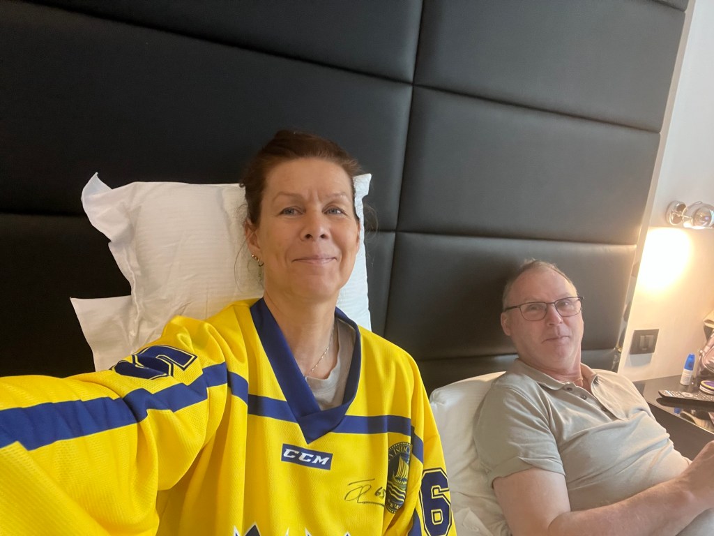 Nu ska bi snart kliva pĂ„ bussen till arenan för nĂ€sta hockeymatch mellan Sverige och Finland. DET blir spĂ€nnande!! Heja Sverige!! đžđȘđžđȘđžđȘ