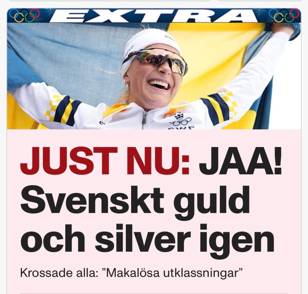 Ja vad sĂ€ger man! Eller skriker? TĂ„rar och glĂ€djetjut i en salig kombination och det var verkligen en otrolig upplevelse att se Fridas andra OS-guld pĂ„ hotellrummet igĂ„r (med tyska kommentatorer). đ Det hade varit grymt att vara pĂ„ plats men det tillĂ€t inte min hĂ€lsa. Bara vila och stillhet sĂ„ tillstĂ„ndet inte blir vĂ€rre. Dagen tog pĂ„ krafterna.