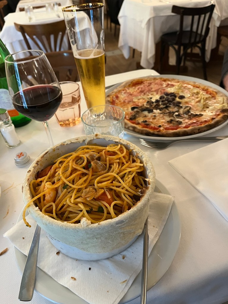 Vi gick ut och kĂ€kade pĂ„ restaurang igĂ„r kvĂ€ll. Jag föredrar grönt đ men igĂ„r blev det blĂ„ klĂ€nning pĂ„ och Jonas tog den blĂ„ kavajen – vi firade Frida och guld och Sverige!! đžđȘđžđȘ För övrigt otroligt god pasta. I det hĂ€r landet kan de det hĂ€r med all dente! đ€©