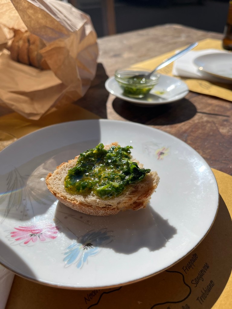 Faktiskt första gĂ„ngen vi har fĂ„tt gremolata. Idag pĂ„ en restaurang till brödet före maten. Vansinnigt gott och smakrikt. Finhackad persilja med citronzest och olivolja – som en dressing. Kan vara vitlök i men det var det inte i vĂ„r variant. Det smakar kanske godare i Italien, ha ha men den ska jag försöka göra hemma.