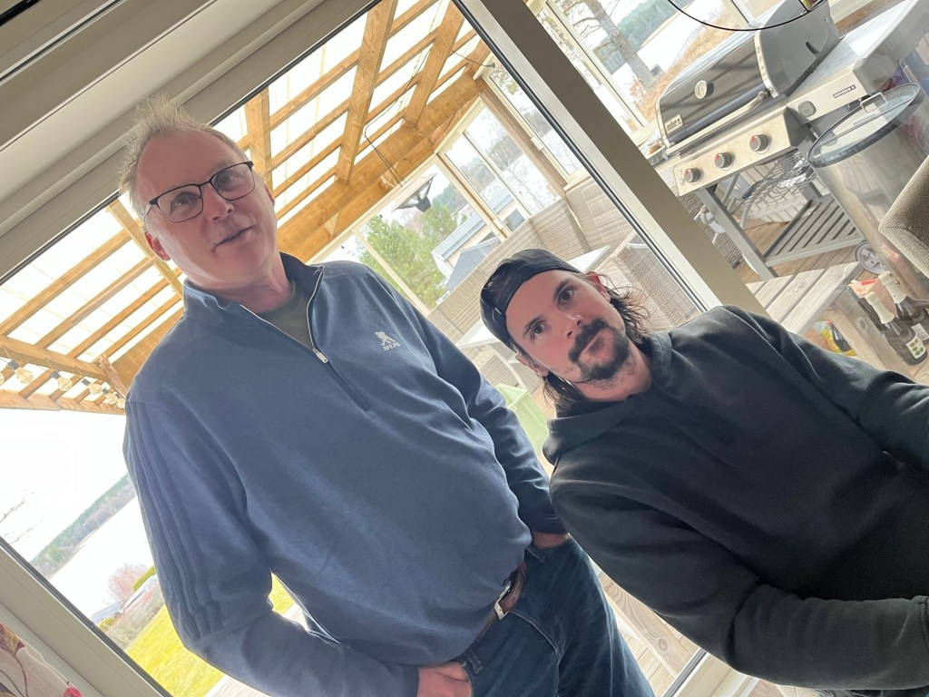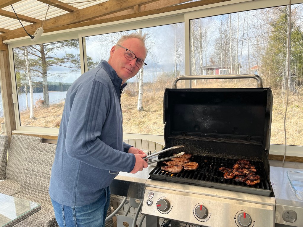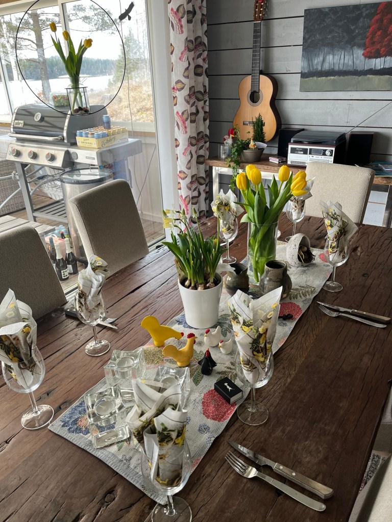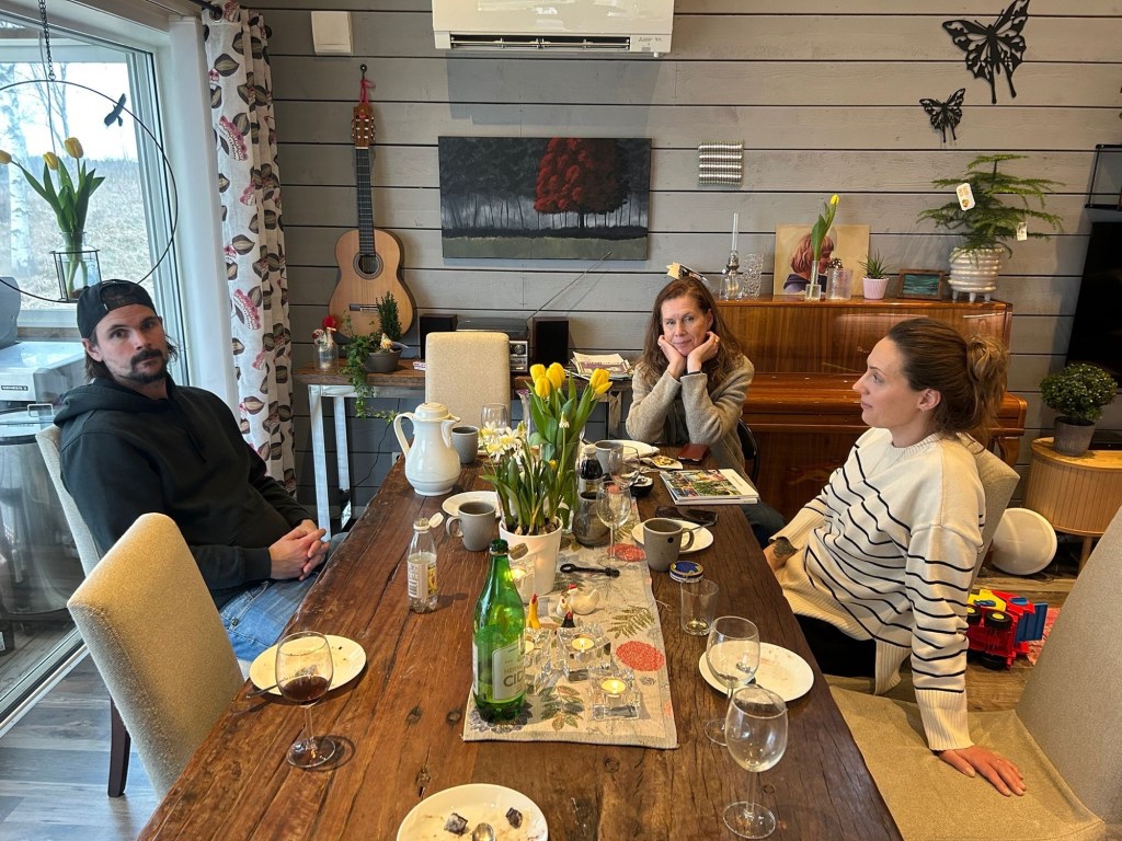 Grillad kyckling och karré plus potatisgratÀng o sallad o sÄs. Mums! à pÄskpyntad kladdkaka o kaffe pÄ det. Mysigt att hÀnga med dem.