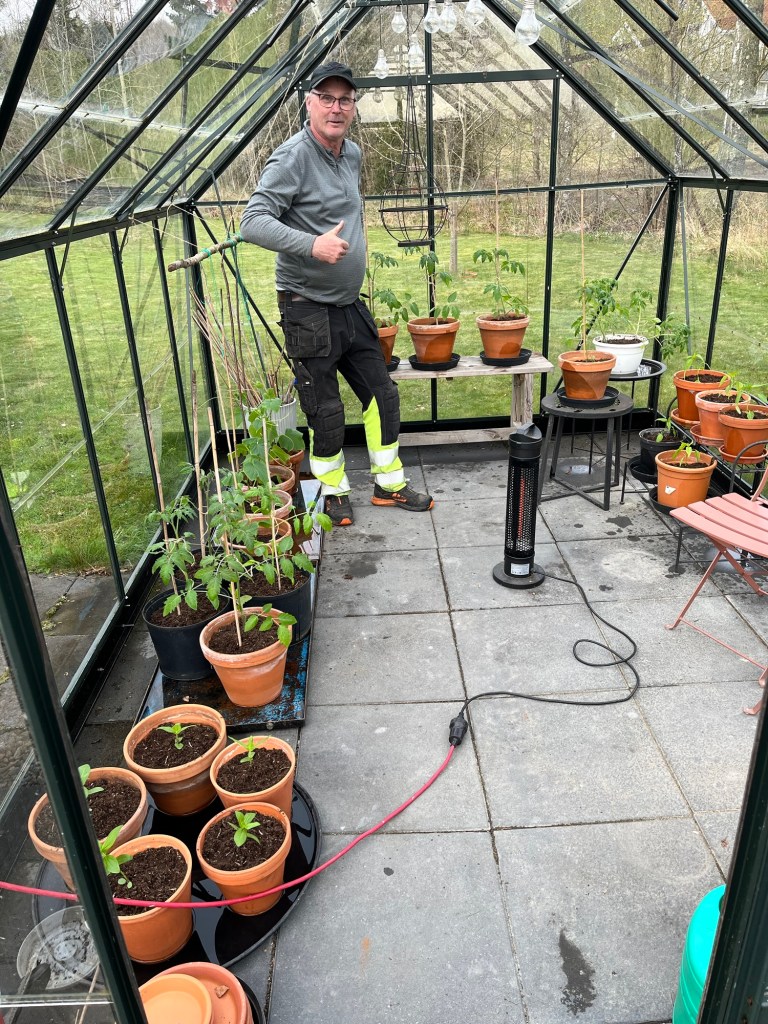 Sedan planterade vi om alla plantor i större krukor och ut med dem i växthuset. Så skönt att få ut dem och förhoppningsvis kommer de att ge riklig skörd framöver. Efter dessa timmar var vi rätt möra. Vi avslutade gårdagskvällen med ett aprilbad. Kallt men skönt (efteråt) som vanligt. 💦💦